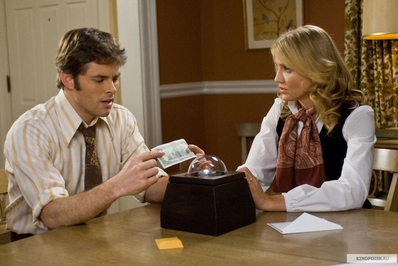 «Посылка». Фильм 2009 г. Жанр: фантастика, триллер, драма. Режиссер: Ричард Келли. Общее впечатление: Каждый из нас сталкивается с выбором. Мы постоянно что-то выбираем, стараемся извлечь из чего-то выгоду, будь то просто поход в магазин, новое место работы, имя для новорожденного. Но как только разговор заходит о деньгах, многие люди готовы идти на разные поступки, чтобы получить зеленую бумажку. Вот представьте, сидите вы дома на диване и вдруг раздается звонок в дверь. перед вами мужчина, не совсем приятной внешности, предлагает вам устройство, нажав на кнопочку которого, вы станете богатым на 1 миллион долларов. А? Какая сумма то, приличная! Но в чем подвох? Да в том, что кто-то на Земле умрет, кто-то не знакомый вам. Так что перевесит в вас? Чувство алчности и корысти, или же сострадание? А может вы вообще не поверите в эту шутку, забросив устройство куда подальше? Именно герои ленты — Артур и Норма (Джеймс Марсден и Камерон Диас) столкнулись с нелегком выбором, пара, которая по