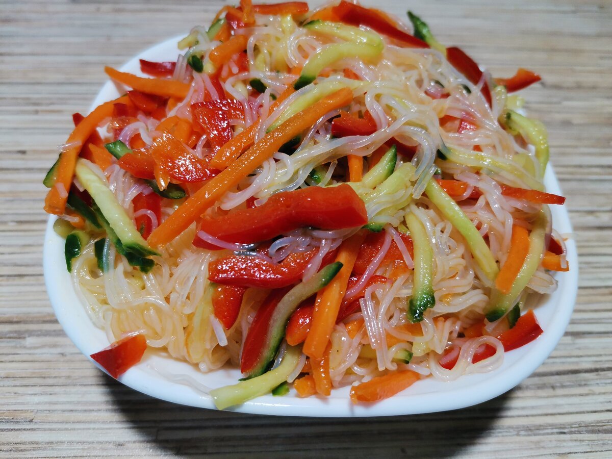 Здравствуйте друзья! Сегодня покажу рецепт лёгкого и очень вкусного салатика с фунчезой, но перед этим расскажу что мне вообще известно об этой лапше (может для кого-то это будет полезная информация). Фунчезу называют стеклянной лапшой, потому что она очень прозрачная в не готовом виде. Пришла она к нам из Восточной кухни, говорят что фунчеза любимое блюдо самураев так как даёт дополнительную энергию и силу организму. Делают её из крахмала бобов мунг, кукурузы, картофеля и рисовой муки. В состав фунчезы входят жирные кислоты, белки, клетчатка, аминокислоты. Она достаточно полезна, её польза в укреплении нервной системы, улучшении умственной деятельности, а ещё она способна выводить токсины из крови. В общем кушать фунчезу можно, главное в правильном количестве. Чем мы сегодня и займёмся! Для салата нам понадобится : Приготовление : На тёрке для корейской морковки трём огурец и морковь, высыпаем всё в одну посуду. Болгарский перец режем небольшими брусочками, оптимально сделать