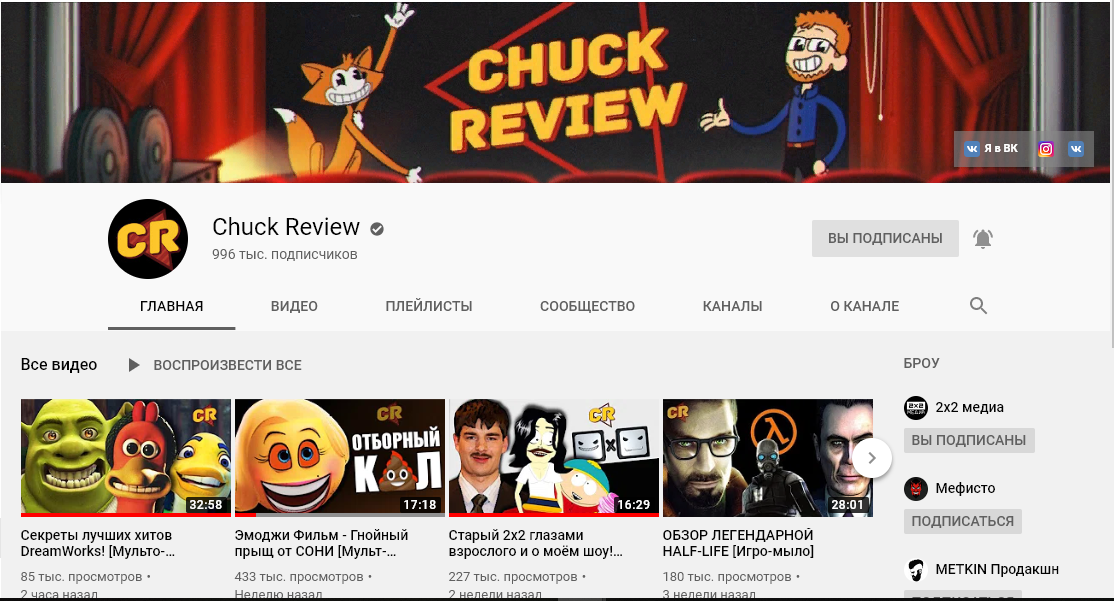 Развлекательные каналы: Chuck Review Ты проник на базу Chuck Review! Мы тут с командой делаем всякие интересные штуки. Говорим о кино, снимаем кино, обзоры пузырим, ностальгируем, играем. Уже семь лет канал стоит на страже отличных фильмов, гасит убогие и отправляет в адское жарево российское телевидение. Присоединяйся в наши славные ряды, иначе товарищ Прохвост тебе руку откусит. За нами не заржавеет! Уголок Акра Обзоры, рецензии и наркоманский бред. RESONANCE Музыкальный канал. Рок музыка, хип-хоп, поп и т.д.. "Музпросвет" - новости. "Плагиат или совпадение"- плагиат и совпадение в музыке и в музыкальных клипах. Обзоры - обзоры разных исполнителей и музыкальный событий: Rammstein, Metallica, Face, Oxxxymiron, Schokk, Скриптонит, versus battle, versus vs slovospb, русский рок vs русский рэп, rock vs rap и т.д.. Аниманьяк Обзоры,посиделки с чаем и общаемся про аниме и видео игры ЧЕРНЫЙ КАБИНЕТ Обзоры кино, критика фильмов, теории и пасхалки…? Нет. "Чер
