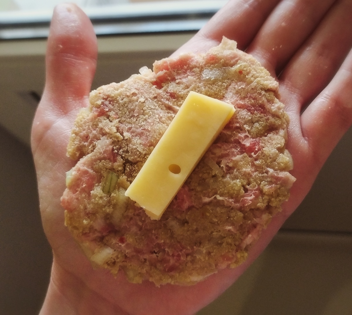 Ингредиенты: 1.Фарш 200гр 2. 3 яичных желтка, они остались с приготовления крема для кулича 3. Луковица -1 шт. маленькая 4. Соль, перец по вкусу 5. Сыр - 1\4 ломтика (прямоугольного) на каждую котлетку 6. Панировочные сухари - 2 ст.л в фарш и для панировки на глаз Приготовление: 1. Лук, фарш и желтки - перемешиваем 2. Ставим в холодильник чтобы ингредиенты подружились 3. Добавляем сухари и ещё раз перемешиваем 4. Отщипываем фарш, делаем из него блинчик в центр которого кладём сыр и закрываем. Раскатываем в руках в форму яйца/шарика/квадратика как вашей душе угодно))) затем обваливаем в панировочных сухарях 5. Обжариваем на сильном огне со всех сторон до золотистой корочки. 6. Накрываем крышкой, убавляем до минимума огонь и оставляем так на минут 15-20. В это время я ещё положила в сковороду уже готовую гречку и все вместе тушила. 7. Выключаем огонь и даём постоять ещё минут 15.