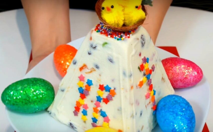 Этот вариант приготовления очень простой, а блюдо получается нежным, буквально тающим во рту. Для начинки я буду использовать изюм, цукаты, курагу и цедру лимона. Вы можете добавить то, что нравится вам. Вам потребуется: Процесс приготовления с фото: 1. Смешайте сметану и сахар. Сюда же добавьте ванильный сахар. Перемешивайте до полного растворения. 2. Творог перетрите через сито или воспользуйтесь погружным блендером. В идеале у вас должна получиться однородная творожная масса. 3. На мелкой терке натрите цедру лимона (только желтую часть) и добавьте в творог. Количество регулируйте по своему вкусу. 4. Добавьте к получившейся массе сметану с сахаром и мягкое сливочное масло. Перебейте все блендером до однородной консистенции. 5. Изюм промойте и ошпарьте кипятком. Курагу нарежьте на небольшие кусочки. 6. Добавьте в «тесто» цукаты, курагу и изюм и хорошенько вымешайте. 7. Форму для пасхи поставьте на неплоскую тарелку, выстелите влажной марлей в один слой и выкладывайт