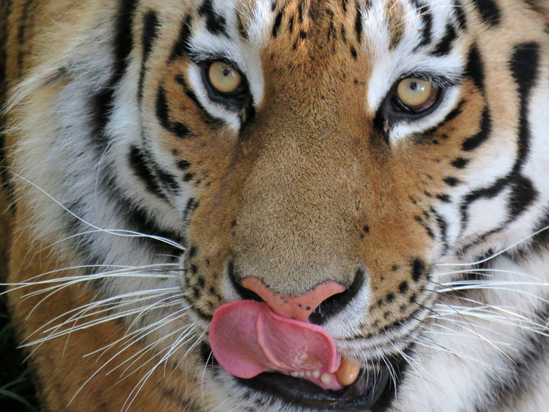 Здесь тиграм каждый день кидают мясо, а раз в неделю запускают к ним живую добычу - даже в неволе тигры не должны терять инстинкт охотника. Где-то за кустами бродил тигр-подросток Шерхан, на кадре ниже в своей вольере греется тигрица Уссури, а на кадре выше - тигр Амур, прославивший в своё время тем, что не съел козла Тимура: