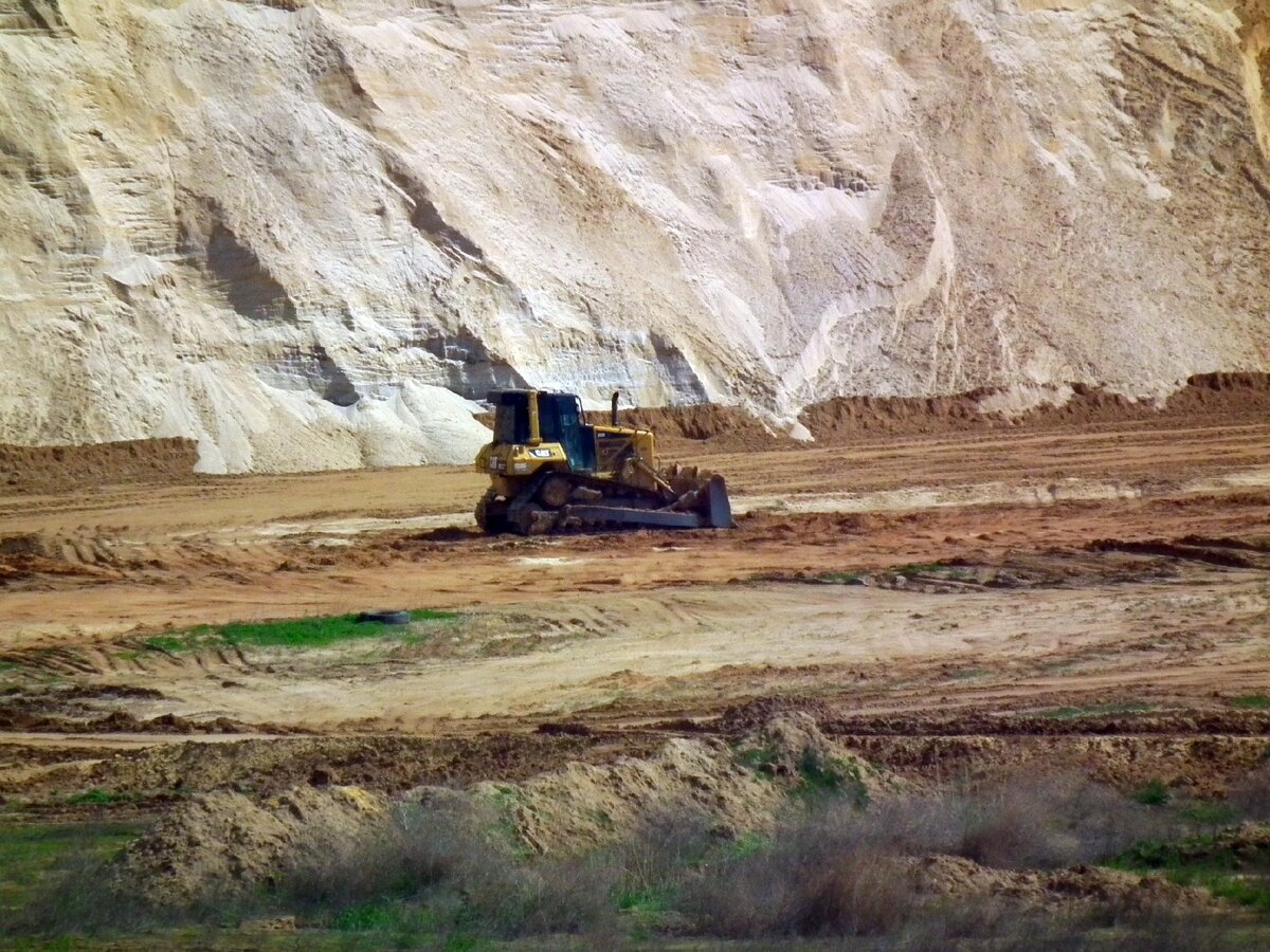 Было лето, была отличная погода, да ещё и выходной. А раз так всё совпало, то почему бы не прокатиться куда-нибудь? В общем долго размышлять я не стал. Взял велик, сунул в рюкзак воду и фотик, и махнул в степи за городом. Поездил по просёлкам, пофоткал окрестности. И так получилось, что на обратном пути я проезжал мимо песчаного карьера. Стало интересно и я подъехал поближе. В сам карьер не спускался, так как это явно не место для покатушек. А вот сверху посмотрел. Тем более, что ничто не мешало подъехать достаточно близко. Ни заборов, ни запрещающих знаков. Странно конечно, с другой стороны территория огромная, её всю не огородишь. Фотографии все старые. Им несколько лет. Поражает толщина песчаного пласта. Техника на его фоне кажется совсем крошечной. Конечно, это не те огромные экскаваторы и самосвалы, которые трудятся на угольных разрезах, такие в нашей области, по-моему, очень трудно встретить. Это обычная техника, которую можно увидеть на любой стройке. Глядя на фото может показат