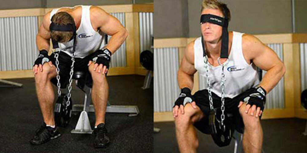 Для тех, кто уже имеет крепкую шею, годится «шлем» из прочных ремней, к которому прикреплено отягощение.