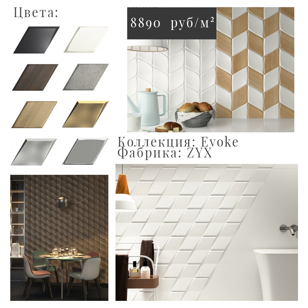 Такая геометрическая плитка будет отличным акцентом в ванной, например за ванной или раковиной с зеркалом. И на кухонном фартуке в скандинавском или современном интерьере. Геометрическую плитку можно комбинировать из разных коллекций одного производителя, так можно создавать необычную и интересную раскладку: