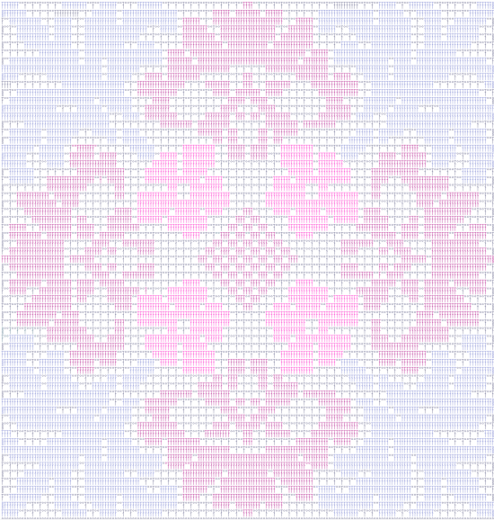 - 1 ССН над ССН нижнего ряда + 1 пустая ячейка; 12 ССН, 1 пустая ячейка, 6 ССН, 2 пустых ячейки, 24 ССН, 2 пустых ячейки, 6 ССН, 1 пустая ячейка, 9 ССН, 2 пустых ячейки, 8 ССН и переходим ко второй половине ряда.