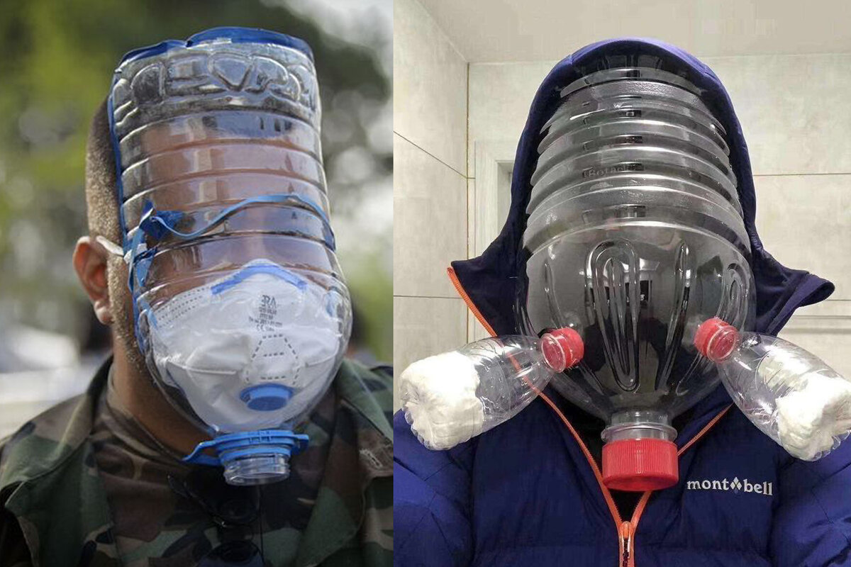 Похоже, защитные медицинские маски настолько прочно вошли в обиход гражданина и человека, что вряд ли уже возможно представить жизнь социума без этого аксессуара. За короткий срок, из разряда сугубо утилитарных товаров, он (маска) перешёл в разряд модного и даже дорогого аксессуара, с помощью которого можно демонстрировать миру своё отношение к нему (к проблеме). Законодателями мод на этом "маска-маскараде" , без сомнения, являются китайцы. Эти неутомимые мастера ножниц и пластиковой бутылки, сооружают доселе невообразимые конструкции, лишь бы как можно выразительнее и ярче выразить своё неприятие "виновнику торжества" (инфекции). На фото ниже - наиболее выразительные представители бутылко-масочного творчества. Контрасты на лицо. Вернее - на лице. Люди в белом предпочитают маски чёрного цвета, в то время, как люди в чёрном отдают предпочтение защитным средствам белого цвета. Инженерная мысль также встрепенулась, усмотрев в сложившейся ситуации немалый потенциал для внедрени