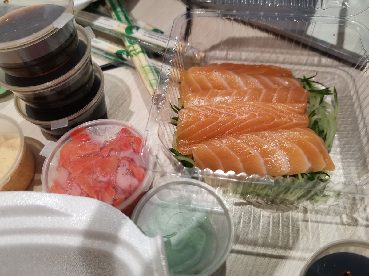 1) Сашими лосось, стоимость - 250 деревянных за 70 грамм.