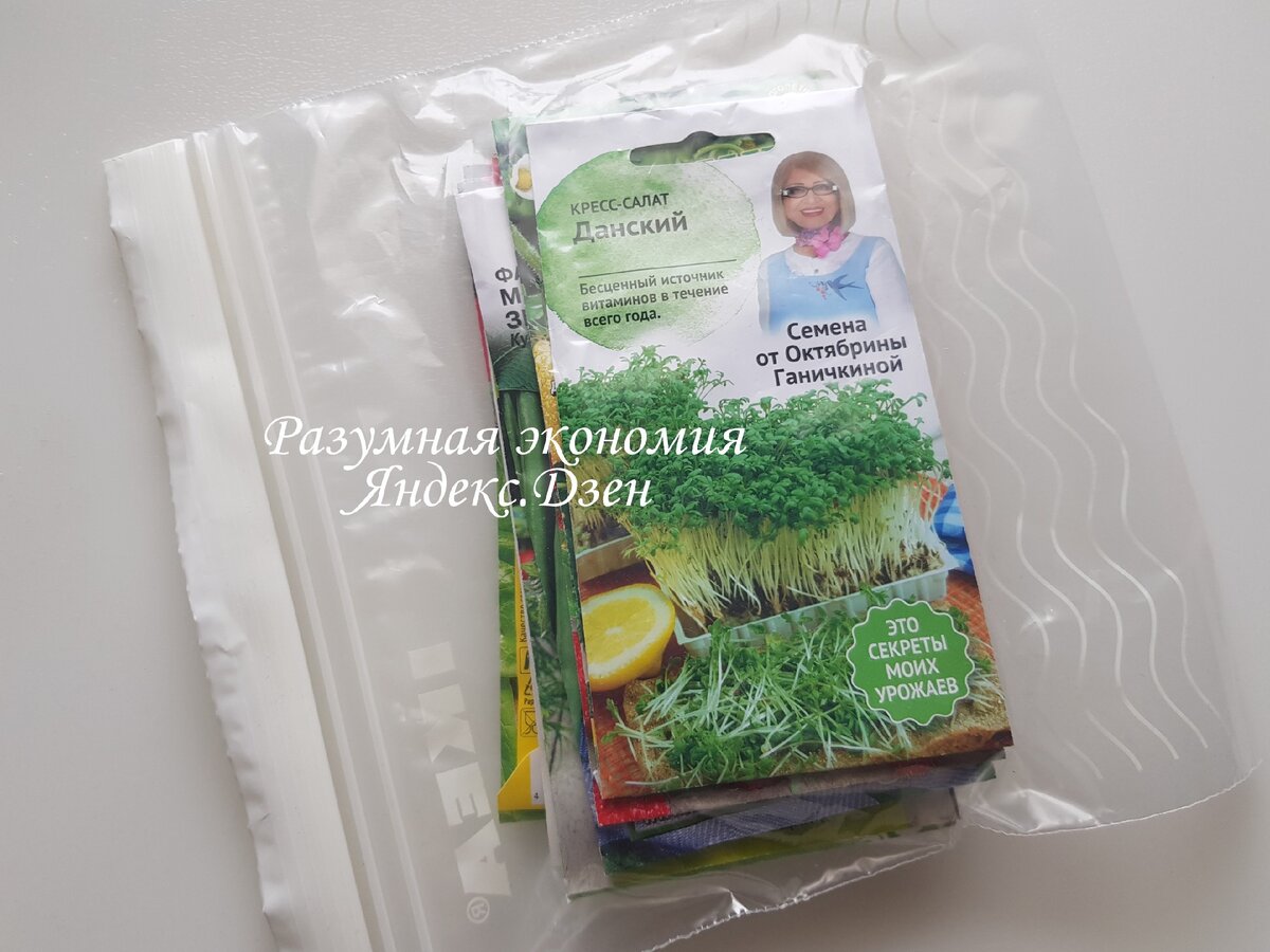 В марте я посадила помидоры и землянику. А через пару недель занялась и другими культурами. Все упаковки, начатые, пустые и новые закрытые я храню в одном плотном пакете на клипсе из Икеа. Упаковки у меня сгруппированы с помощью скрепок.