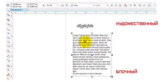 Инструменты для работы с текстом В CorelDraw работа с текстом включает в себя много дополнительных инструментов, а также вариантов, с помощью которых Вы можете, непосредственно, работать с текстом. Текст можно разделить на два основных типа в CorelDraw: · Художественный (фигурный); · Блочный. Главные различия между этими блоками в графическом отображении текста. Фигурный (художественный вариант) – это удобная вещь, когда Вам необходимо написать короткий текст. Чтобы его использовать, необходимо выбрать инструмент «Текст», далее щелкнуть ЛКМ и начать печатать текст. Но подходит это только для использования при печати нескольких или вообще одной фразы. То есть Вы напечатали и сразу обработали. Если необходимо Вам напечатать обширное количество информации (много текста), тогда используйте блочный текст. С помощью мышки зажмите левую кнопку мыши и создайте блок, в который впоследствии внесите всю информацию. При блочном формате текста, он будет находится в заданных рамках, а также вы
