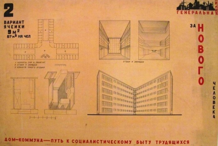 Среди «передовых» проектов общественных домов-коммун были и многоэтажки с дворами-холлами, и трехэтажные секционные жилые здания с совмещенными корпусами или расположенными рядом помещениями общественного обслуживания. Предполагалось, что советские граждане не будут отвлекаться на быт (стирка, готовка и так далее) и их частная жизнь будет максимально открыта общественности.