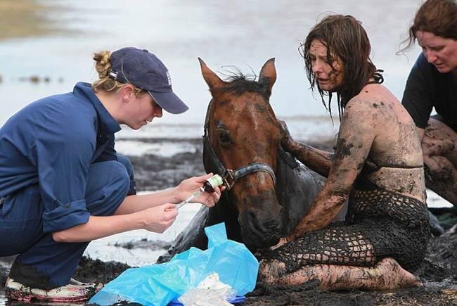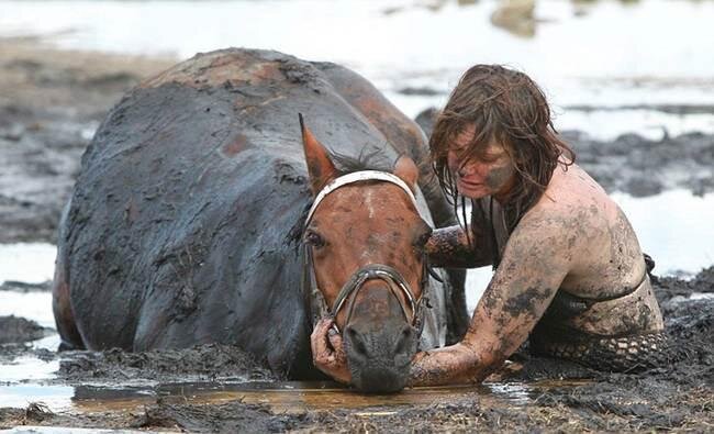 Хозяйка сразу же оценила ситуацию и поняла, что без помощи людей шансов выбраться из смертельной ловушки у ее питомца просто нет. Девушка спешилась и полезла в грязь за своим конем.