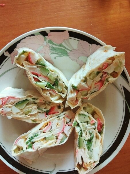 Лаваш смазываем плавленным сыром (у меня грибной) , в отдельную тарелку нарезаем 2 вареных яйца, упаковку крабовых палочек,2 огурца,зелень , солим и перчим, заправляем майонезом и все перемешиваем.