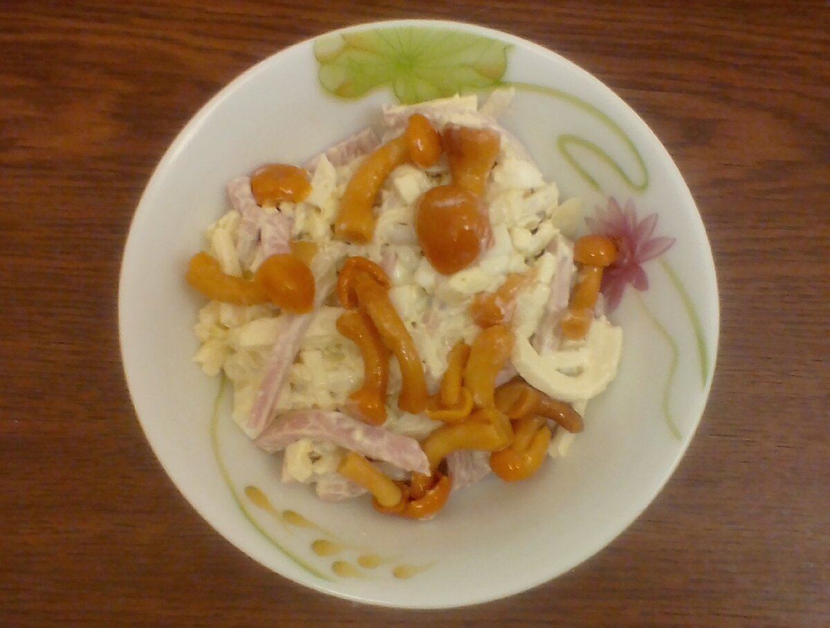 Ингредиенты: Ветчина - 200 грамм Кальмары - 200 грамм Опята маринованные - 100 грамм Яйца - 3 штуки Лук репчатый - 1 штука Сыр твёрдый - 50 грамм Сметана 15% -100 грамм Соль - по вкусу Приготовление: Ветчину нарезать соломкой. Кальмары отварить и нарезать полукольцами. Яйца сварить. Нарезать мелко яйца и лук. Сыр натереть на крупной тёрке. Все ингредиенты перемешать, посолить и заправить сметаной. Приятного аппетита! Подписывайтесь на наш полезный канал и ставьте лайк!