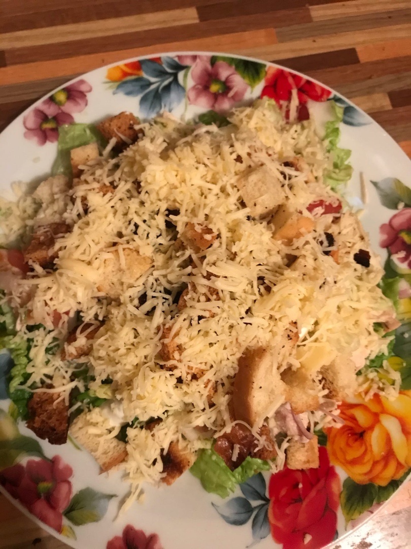 Ингредиенты: Куриная грудка Листья салата Помидоры Батон (для сухариков) Сыр Лук Соль Растительное масло Соус для салата «Цезарь» (продают в магазинах) Приготовление: 1. Батон нарезать кубиками и на сухом противне в духовке обжариваем до золотистой корочки. 2. Куриную грудку (посолить, добавить специй) обжарить на сковороде в растительном масле. 3. Нарезать помидоры и поместить в блюдо. 4. Листья салата нарезать и добавить в блюдо к помидорам. 5, Затем в блюдо добавить курицу (разрезать кубиками). 6. Лук (по желанию) нарезать и добавить к вышеперечисленным ингредиентам. Перемешать, посолить. 7. Сухарики выложить в отдельную посуду. 8. Сыр натереть на терке и тоже поместить в отдельное блюдо. 9. Подача салата: на тарелку выложить салат, затем добавить сухарики, сверху сыр и полить соусом.