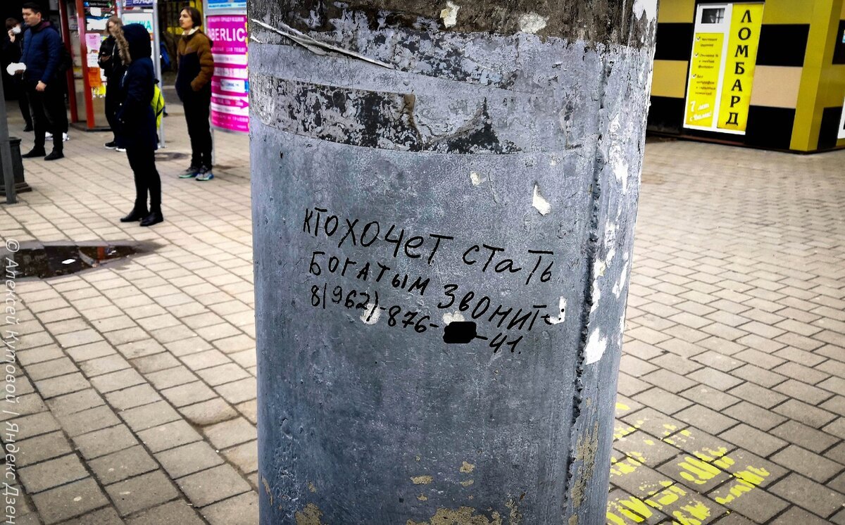 Недавно ехал на автобусе по одной улице и в окно увидел занимательное объявление на столбе: "Кто хочет стать богатым, звоните". Номер записать не успел, но объявление не выходило из головы. Сегодня выдалась возможность позвонить и узнать что же могут предложить. Объявление о работе на столбе. Вакансия для будущего Рокфеллера :) Я понимал, что это либо развод, либо что-то незаконное, но прям разбирало любопытство выяснить подробности. Дозвониться удалось не сразу. В первый раз трубку никто не взял. Через 20 минут с этого номера мне прошел "еврейский дозвон" и ответить я не успел. Перезвонил — опять нет ответа. Странно. Спустя час человек все же решил повторить звонок и на этот раз я успел ответить. — Алло. — Вы мне звонили сегодня. Что-то хотели? — Да, здравствуйте. Увидел ваше объявление на столбе. Так вот, хочу стать богатым. Очень интересно что за работу предлагаете. — А-а, я вас понял. — Еще актуально? — Да, актуально. У вас машина есть? — Нет, а обязательно? — Ну работа разъездн