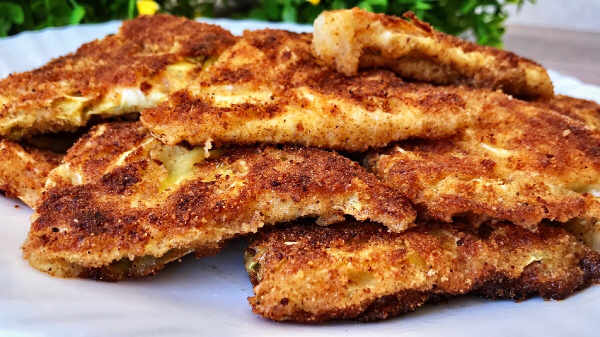 5. Беру одно яйцо, подбиваю его вилочкой. 40 г панировочных сухарей. Начинаю обжаривать блинчики. Окунаю сначала в яйцо , потом - в сухари и выкладываю на горячую сковороду с растительным маслом.