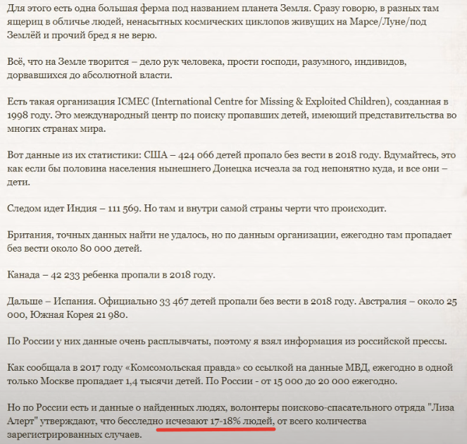См. скрин. Красной чертой подчеркнуто, что только 17% пропало и не найдено. Ушедший погулять мальчик, записанный в полицию, также попадает в статистику пропавших детей, однако, через день он нашелся сам и был у бабушки. Это пример. Поэтому к источнику таких фэйковых новостей необходимо относиться осторожно. Искать в них многоходовку, то есть скрытую цель... не заметную без анализа других новостей. Поясним, почему... Это текст из фэйкового панического видео.