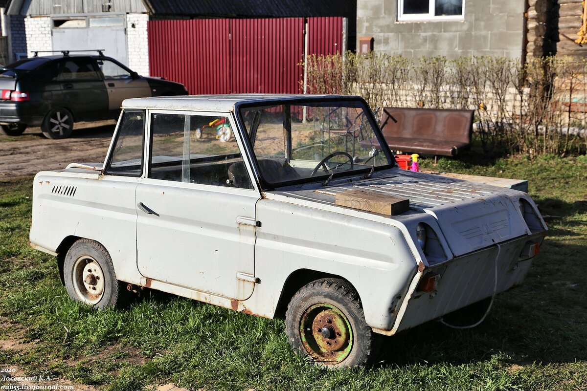 Недавно попался мне во Владимирской области уже достаточно редкий образец техники - мотоколяска С3Д. Эта двухместная машинка с ручным управлением производилась на Серпуховском мотозаводе с 1970 по 1997 год и предназначалась для выдачи инвалидам через органы соцобеспечения, за что и получила своё прозвище - "инвалидка". В находящемся сзади моторном отделении находился мотоциклетный одноцилиндровый двухтактный двигатель "Иж-Планета-3" (на ранних модификациях мотоколяски - "Иж-Планета-2"), дефорсированный до 14 л.с. Для весившей в снаряжённом состоянии почти 500 кг С3Д это было явно маловато, и она с трудом разгонялась до своей максималки в 55 км/ч. Коробка передач также использовалась мотоциклетная, поэтому для реализации заднего хода в конструкцию был добавлен реверс-редуктор, подключавшийся отдельным рычагом. На встретившейся мне мотоколяске двигатель и КПП отсутствовали. Всё управление С3Д состояло из руля и различных рычагов - на рулевой колонке размещались рычаги газа и