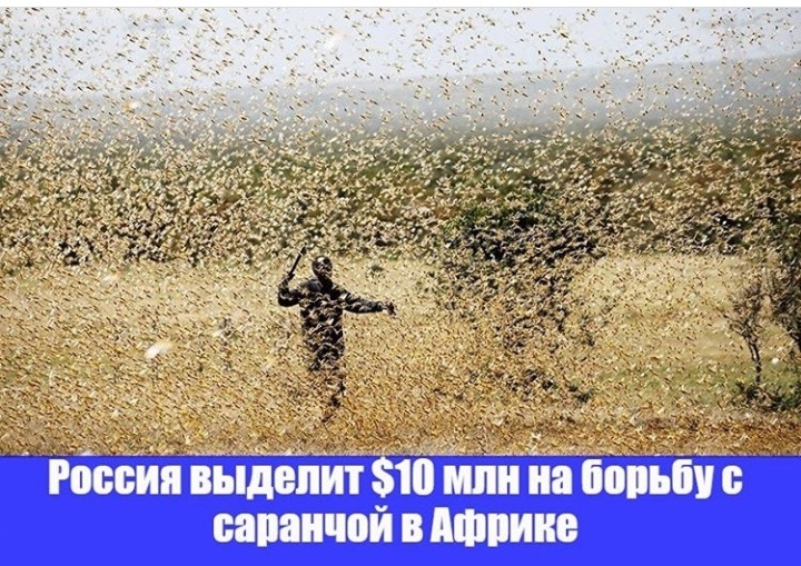 Кабмин России принял решение выделить до $10 млн Продовольственной и сельскохозяйственной организации (ФАО) ООН для борьбы с нашествием саранчи в африканских странах. Об этом говорится распоряжении правительства, опубликованном в понедельник, 27 апреля, на официальном портале правовой информации. ⠀ «Внести в 2020 году за счет бюджетных ассигнований федерального бюджета добровольный целевой взнос Российской Федерации в размере до $10 млн США в фонд Продовольственной и сельскохозяйственной Организации Объединенных Наций на финансирование расходов, связанных с реализацией мероприятий по борьбе с нашествием саранчовых», ― отмечается в документе. ⠀ Подчеркивается, что по $3 млн будут направлены в Эфиопию, Кению и Уганду, а $1 млн ― в Южный Судан. Также в распоряжении говорится о том, что МИД России должен проинформировать ФАО о принятом решении, а Минфин ― обсудить с организацией порядок перечисления средств и использования взноса. ⠀ В середине апреля был опубликован доклад ООН, согласно ко
