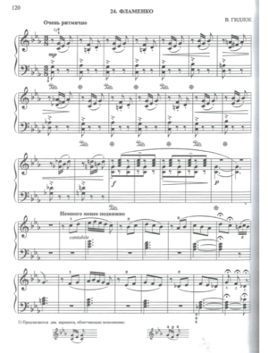 — взрослые, начиная со 2-го года обучения — разбор с преподавателем Главные достоинства Фламенко: Доступность разбора. По сути в первой части и репризе структура первого такта в точности повторяется от разных нот. Взрослые разберут сами, а маленьким вложить в руки очень легко (не брезгуя сольфеджио при этом, все же); даже игровой элемент привнести здесь можно — чтобы сами искали первую ноту каждого такта методом сольфеджио, а дальше старались повторить уже выученный заранее первый такт от этих самых нот (транспонировать). Разнохарактерность. В отличие от ритмичной задорной первой части середина должна быть сыграна мягче, плавнее. В ней также есть речитативность за счет фермат, в общем, есть что показать по
