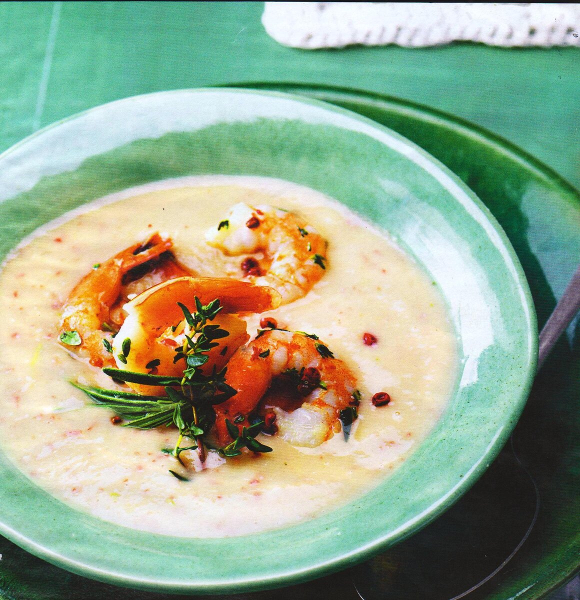 Блюдо для гурмана! Ингредиенты на 4 порции: 250 г креветок 300 г филе трески соль перец 1 перец чили 20 г имбиря 1 зубчик чеснока 250 г моркови 3 ст. ложки оливкового масла 400 мл кокосового молока 800 мл овощного бульона 200 г бобов из банки 3 ст. ложки сока лимона 1 пучок кориандра Креветки разморозить, очистить. Филе трески нарезать, приправить специями. Чили, имбирь, чеснок почистить и мелко порубить, тушить в разогретом масле. Влить кокосовое молоко и бульон, довести до кипения. Креветки, рыбу и бобы положить в суп, варить 3 минуты. Добавить сок лимона и рубленый кориандр. Посолить, поперчить. Приятного аппетита!