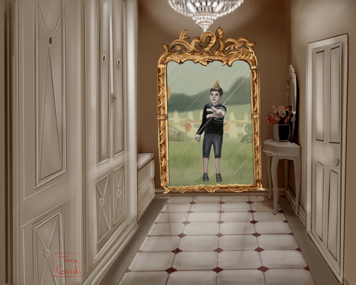 Кон протер глаза, дабы избавиться от странного виденья, но толку это не принесло; мальчик стоял в зеркале с протянутой рукой и просил подойти.