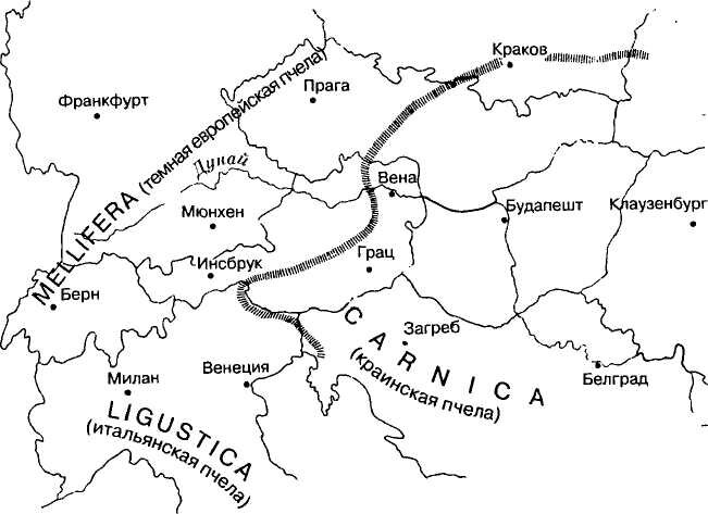 Распространенная в Европе медоносная пчела, Apis mellifera, - это вид, не способный к скрещиванию с другими, большей частью тропическими видами (например, с азиатской Apis cerana). В ходе развития Земли в Европе возникли две расовые группы пчел, приспособленные к различным климатическим условиям. 1. Темная европейская пчела (A. mellifera, которую пчеловоды между собой называют «нигра»), первоначально населявшая всю Европу к северу от Альп, между Пиренеями и Уралом. Испанская пчела — ее близкая родственница. 2. Балканские породы, группа близкородственных типов, из которых краинская пчела (A. Mellifera cernica) являются самыми известными. В Греции встречаются пчелы, очень похожие на краинских: македонская пчела на севере и кекропская — на юге страны. Кроме этих двух европейских.расовых групп есть среди наших медоносных пчел еще две другие: восточная группа (анатолийская и кавказская породы) и африканс кая группа (ставшая знаменитой в Америке и названная там «черт с жалом» - Scutellata и африканская горная пчела, А. т. monticola). Подробное иллюстрированное описание 24 различных пород западной медоносной пчелы читатель найдет в изданной автором «Естественной истории медоносных пчел», (350 С. изд-во Эренвирт. 1992). Там сделана попытка дать подробный обзор истории, поведения и изменений пород, используемых в промышленных целях, особенно краинских и темных европейских пчел. Пчелы Carnica и Mellifera первоначально были отделены друг от друга в Альпах естественной границей. Здесь граничили две большие области распространения обеих рас: к северу и к западу от Альп было царство темной европейской пчелы, от бассейна Дуная и от Балкан к Альпам распространялись краинские пчелы. Поэтому к югу и востоку от Альпийского хребта мы находим аборигенную область краинских пчел, а к северу от водораздела и к западу - пчел Mellifera. Точнее сказать, Форарльберг, Тироль, Зальцбург без Лунгау, Верхняя Австрия со штирийской долиной р. Энс, западная часть Нижней Австрии были первоначально заселены «темными», а остальные области Австрии (Восточный Тироль, Каринтил, большая часть Штирмарка и Бургенланда, а также восточная и южная части Нижней Австрии) - «серыми». Западная граница распространения краинских пчел проходит через долину Пустера близ австрийско-итальянской границы. Там краинские пчелы граничат к западу с темной пчелой, к югу с итальянской. Венецианские Альпы - преимущественно «серые»; а в Западных Юлийских Альпах и в Истрии обитают только серые пчелы, хотя венецианская равнина относится к области распространения пчел Ligustica (итальянских). Южный Тироль - «Уголок трех стран» с черными, серыми и желтыми пчелами, но первоначально тирольская пчела была, по-видимому, черной, как и везде в Западных Альпах. На востоке граница распространения краинских пчел менее резкая, т. к. естественные барьеры здесь выражены слабее. В Словакии пчелы явно краинские, с более или менее сильным отпечатком Mellifera. В Чехии и Моравии пчелы смешанной породы, на юго-востоке преобладают пчелы с характером Carnica, на западе и севере - с характерными признаками Mellifera. На юге Польши (Галиция, Татры) пчелы носят явный отпечаток краинских; в центральных и северных районах имеются семьи с чистыми признаками Mellifera. В России происходящая от карники украинская степная пчела постепенно переходит в темную форму, характерную для северной лесной зо