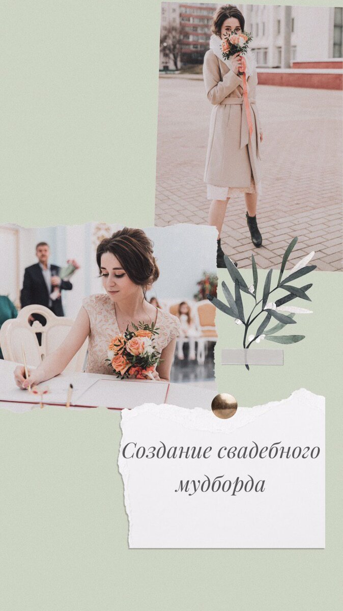 Прежде чем окунуться с головой в расчеты, поиски площадок и составления списка гостей давайте займемся визуализацией. Мудборд (Moodboard) - визуализация торжества на основе картинок, цветовых сочетаний, элементов дизайна и прочее. Не важно, будет ли это распечатанные картинки, размещенные на ватмане или просто папка сохраненных файлов на телефоне/компьютере, мудборд помогает собрать по крупицам желаемые элементы торжества, определиться со стилистикой и цветовой гаммой. Где же искать те самые картинки?Моим верным помощником стал Pinterest. Там же я собрала "доску", определила цветовую гамму, дизайн торта и букета невесты, элементы декора и многое другое. Помимо Pinterest можно вдохновляться за просмотров свадебных журналов или сайтов. Все это позволит выявить свадебные тренды, выработать индивидуальный стиль. Мой свадебный мудборд выглядел приблизительно так: Хочется отметить следующее: 1. Мудборд поможет понять, что Вам нравится, а что нет. Возможно, найдутся "те самые" детали вашег
