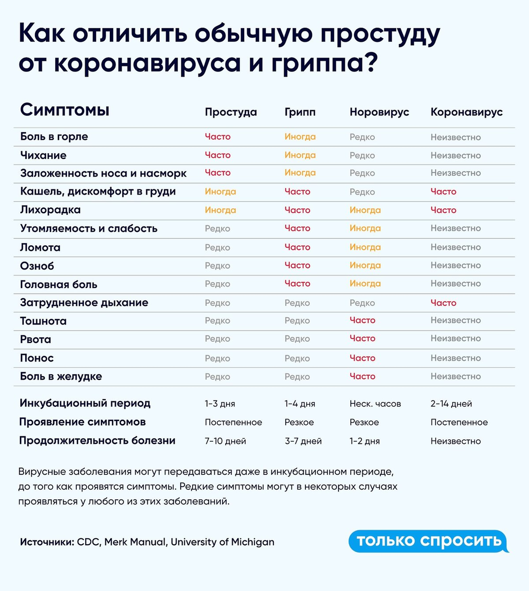 Новый коронавирус попадает в организм через слизистые (дыхательных путей, конъюнктивы глаз, и так далее), впрочем, как и все другие респираторные вирусы, включая грипп. По данным ВОЗ чаще всего заболевание начинается со слабости и недомогания, повышения температуры и сухого кашля. У некоторых людей могут отмечаться боли и ломота в мышцах и суставах, заложенность носа, насморк, фарингит или диарея. Чаще всего, эти симптомы развиваются постепенно и проявляются довольно слабо. До 80% случаев заболеваний протекают легко, сопровождаясь лишь легким недомоганием и невысокой температурой. У некоторых инфицированных людей вообще не возникает каких-либо симптомов или плохого самочувствия. В отличии от многих других респираторных вирусов, коронавирус чаще атакует нижние дыхательные пути — бронхи и легкие, вызывая пневмонию и дыхательную недостаточность, которая и является причиной смерти у пациентов из группы риска (пожилой возраст, хронические сопутствующие заболевания). Поэтому при усугублени