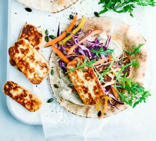 Попробуйте этот простой вегетарианские рецепт, который вы полюбите с первого раза. Сыр халлуми с хрустящей капустой и щедрой порцией хумуса.