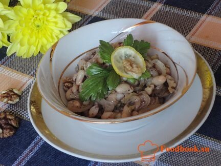 Измельчаем укроп. 3. Отварим фасоль, далее сливаем воду. В посуде смешаем фасоль, обжаренный лук, грецкие орехи и зелень. Добавим специи, и немного сок лимона. Перемешаем.