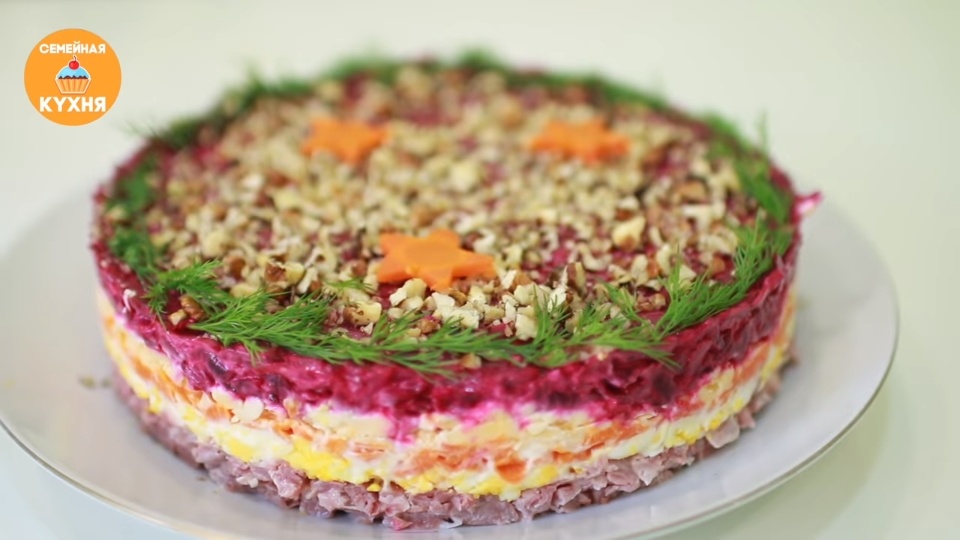Слоеный салат с копченым мясом, твердым сыром и овощами. Многослойный праздничный салат. ИНГРЕДИЕНТЫ: Форма 22 см: ПРОЦЕСС ПРИГОТОВЛЕНИЯ: 1. Для салата нам нужна чистая мякоть из ножки индейки. Отделяем мясо от кости. Нарезаем мясо мелкими кусочками. 2. Перекладываем в глубокую тарелку. Два зубчика чеснока мелко измельчаем. Перекладываем чеснок в мясо и добавляем пару ложек майонеза. Перемешиваем. На широкое блюдо устанавливаем раздвижные боковины от формы для выпечки. Выкладываем мясо. Разравниваем и слегка утрамбовываем. 3. На крупной терке натираем вареные яйца. Разравниваем. Смазываем майонезом. Натираем на крупной терке вареную морковь. Разравниваем. Смазываем майонезом. 4. Следующий слой - тертый сыр. Смазываем майонезом. В глубокую тарелку на крупную терку натираем отваренную свеклу. Измельчаем зубчик чеснока. Добавляем его в свеклу, добавляем немного майонеза. Перемешиваем. Выкладываем следующий слой из свеклы. 5. Для салата орехи необходимо предварительно обжарить и