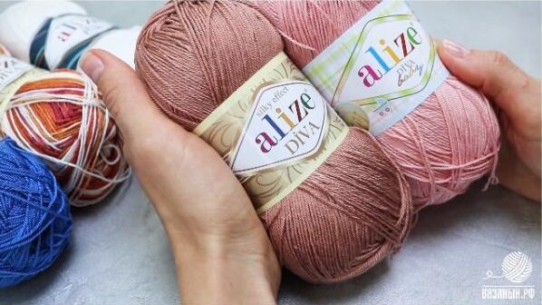 Пряжа Diva Alize – представлена в пяти вариантах с почти одинаковым составом: Diva, Diva Beby, Diva Plus, Diva Stretch и Diva Batik. Основа Diva Alize – микрофибра, искусственная нить, ворсинки которой в 40 раз тоньше шерсти. За счет этого легче провязывать узоры. Микрофибра, как и акрил, способна сохранять изначальный цвет и форму, даже после множества стирок не грубеет, а так же стойка к ультрафиолету. За эти качества нитка и ценится рукодельницами. Характеристики пряжи Diva, Diva Beby, Diva Batik: Характеристики пряжи Diva Stretch: Характеристики пряжи Diva Plus: Нить всех пяти вариантов состоит из четырех отдельных ниточек. Diva Скрутка плотная, не расслаивается при вязании. Имеет легкий шелковистый эффект, отчего немного скользкая. Однако несмотря на шелковистость нити рельефный узор спицами из нее не теряет своей объемности. Изделие эластичное, хорошо сохраняет форму. Вязаный крючком образец максимально раскрывает ее шелковистый эффект. Полотно получается легкое, пласт