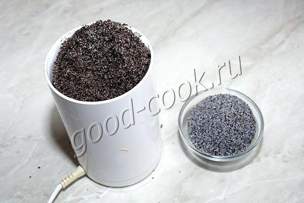 Мак размолоть вместе с сахаром в кофемолке. Если размалывать один мак, без сахара, он быстро выделит масло и слипнется. Миксером смешать до однородности яйца, 1 столовую ложку растительного масла, молотый мак с сахаром, соль, соду и разрыхлитель. Вмешать 1 стакан муки (160г) и 150 граммов молока. Затем в получившееся однородное тесто вмешать ещё один стакан муки и оставшееся молоко (450~500г).