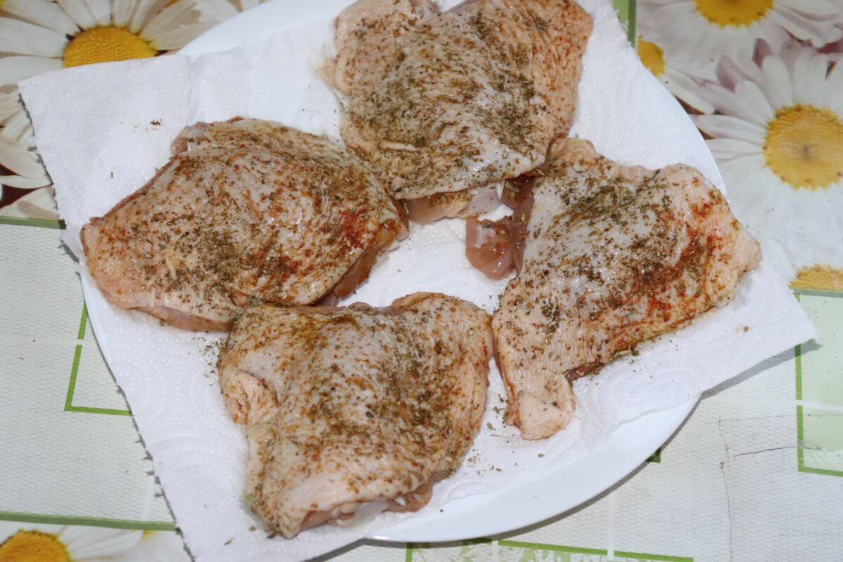 Куриные бедра я помыла и обмакнула бумажным полотенцем для удаления лишней влаги.