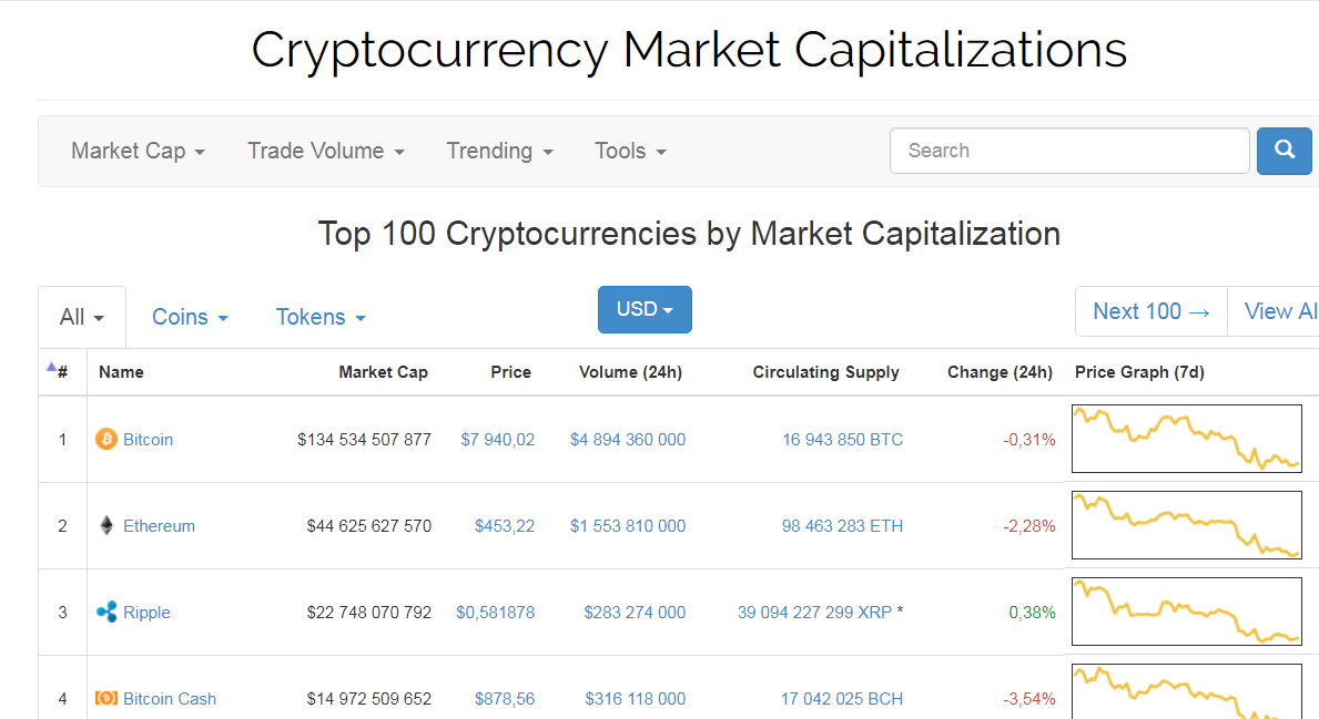 Чтобы отследить этот параметр на сайте coinmarketcap.com и просмотреть список криптомонет с максимальной капитализацией, идущей на убывание, жмем кнопку сверху «Market Cap». Это даст возможность отфильтровывать список по объему капитализации криптовалют.