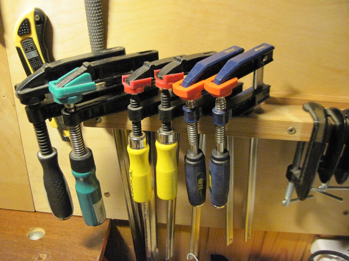 Мои боевые F и G струбцины. Мощные, крепкие! Висят удобно - всегда под рукой! Но в последнее время в некоторых проектах возникла необходимость в одноруких. Вот прикупил быстрозажимных/одноруких/пистолетных. Мелкие пристроил, а зеленые лошади никуда не лезут ) (рука чисто для масштаба :) Залез под верстак - нарыл обрезков. Шурик, перьевое сверло и давай кидаться опилками направо-налево ) Вот такую хрендебобину изваял) Ну и конечно косяки - наше всё ))) Косяки - отличные учителя ))) Конечно не учёл тонкие уголки фанеры - при вкручивании даже с предварительным засверливанием они подразошлись - пришлось срочно подклеивать. Заводим, поворачиваем! Крепко висят, не выскальзывают! Так мне казалось тогда :) Как то так. Если понравится и бренд себя хорошо покажет - ещё пару прикуплю, покороче ))) вон и местечки для них остались :) Прикупил пару покороче. Стал использовать чаще, повесил поближе, стал периодически задевать руками ... и они стали валиться на бошку ))) Пришлось довести до ума - сде
