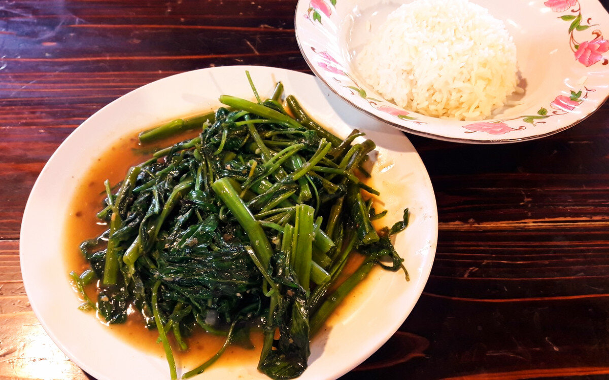 Я, как заядлый мясоед. обратила внимание на это блюдо, только из любопытства. Его часто заказывают местные жители и туристы-азиаты. Для меня было странно, покупать блюдо из травы, по стоимости равной блюду из мяса, но любопытство победило и вот у нас на столе Morning glory с вареным рисом.