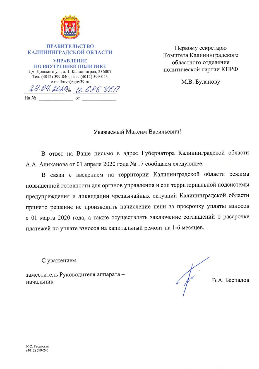 Сразу после того, как в нашей области объявили нерабочие дни, а жителей отправили по домам соблюдать самоизоляцию, оставив очень многих без средств к существованию, калининградские коммунисты направили обращение за подписью первого секретаря Комитета Калининградского областного отделения КПРФ Максима Буланова на имя губернатора Антона Алиханова с призывом поддержать граждан и на время карантинных мер отменить, как минимум, платежи за капитальный ремонт. Как это сделали власти Москвы и некоторых других регионов России. Безусловно, этой меры было бы недостаточно, и напрашивается решение об отмене всех коммунальных платежей до восстановления привычной жизни людей и другие принципиальные меры поддержки. Однако коммунисты, понимая, что ждать щедрости от жадной единороссовской власти бесполезно, рассчитывали хотя бы на ту помощь калининградцам, которая уже оказывается людям в других регионах страны. Но для правительства Калининградской области и приостановка начислений на капитальный рем