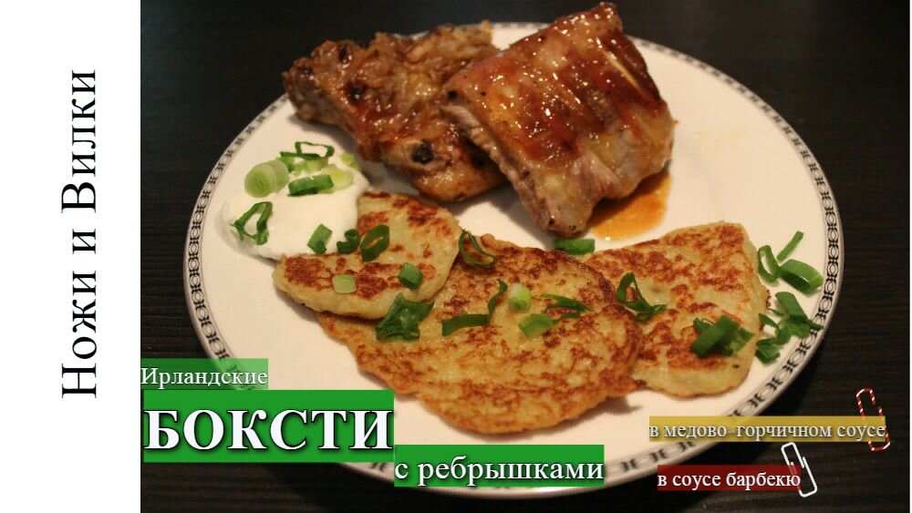 Готовим ирландские Боксти с ребрышками. Боксти это старинное Ирландское национальное блюдо. Боксти схожи с драниками. Состав Боксти: Молоко 3,2% ... 1 стакан Картофель ... 1 кг. Мука ... 200 гр. Лимон ... 1 шт. Слив. масло ... 100 гр. Сода ... 0,5 ч.ложки Зелёный лук и сметана ... для подачи Соль по вкусу Состав рёбрышки : Рёбра ... 500 гр. Лук репчатый ... 2-3 шт. Мёд ... 2 ст. ложки Горчица ... 1 ст. ложка Соус барбекю ... 3 ст. ложки Масло оливковое ... 1 ст. ложка Соль и перец по вкусу Боксти: 1. Картофель делим на две ровные части. Одну часть варим до готовности, вторую трём на мелкой терке. 2. Натёртый картофель отжимаем, чтобы избавиться от лишней влаги. 3. Готовим Пахту. В чашку наливаем стакан тёплого молока и выжимаем лимонный сок (2 ст. ложки). Оставляем на 10 минут, немного загустеет. 4. Готовый картофель давим и получаем пюре. 5. Варёный картофель и тёртый соединяем в миске. Добавляем половинку чайной ложки соды и две чайных ложки соли. 6. В
