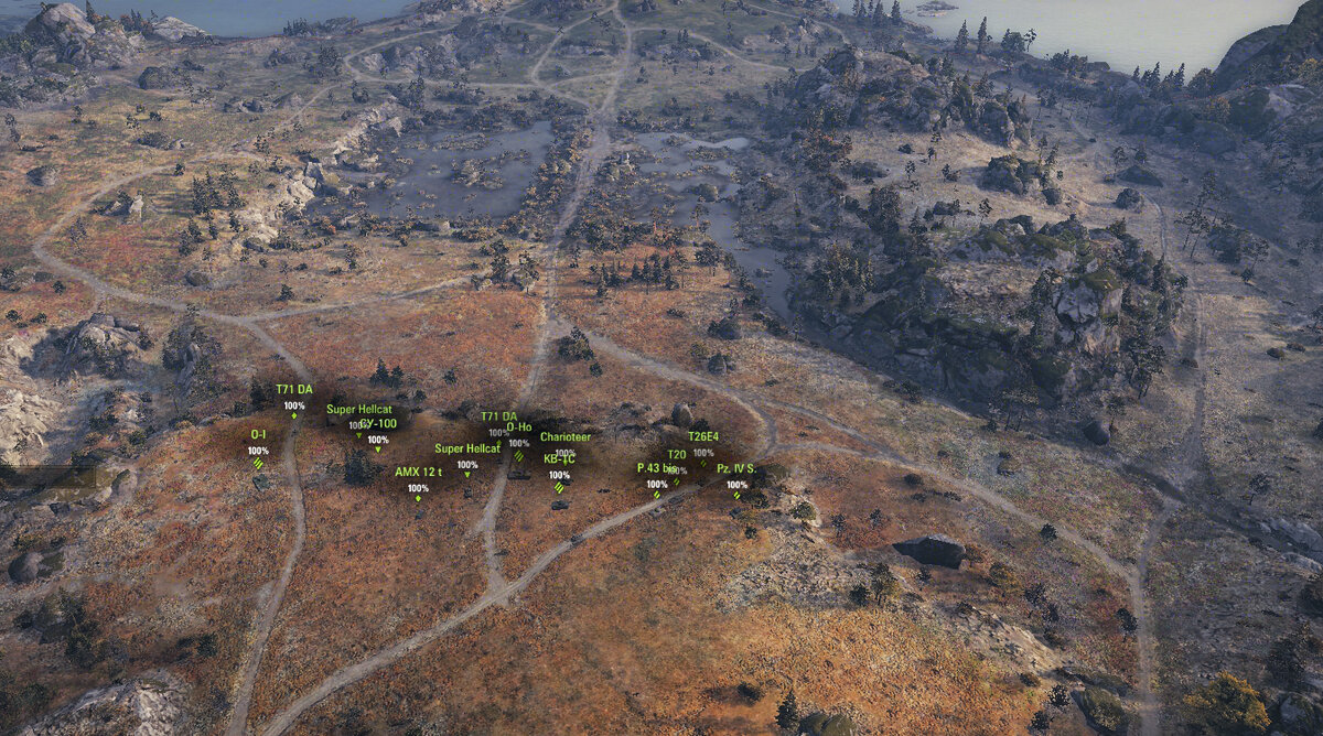 Локация "Карелия". Стандартный тип боя игры "Мир танков" отличается от режимов «Штурм» и «Встречный бой» тем, что базы находятся в других точках карты. Локация А Вначале рассмотрим позиции стороны, реппаун которой расположен в месте, где горный хребет и "коридор" за ним находятся на правом фланге, а каменистое плато с небольшими скалами с левой стороны. Позиции для прострела "коридора" 1. Более безопасная позиция, при которой возможно вести огонь по наступающему неприятелю, поддерживая свою бронетехнику. Но, и, соответственно результативность может быть меньше. 2. Очень опасная точка обстрела! Рекомендуется занимать игрокам, имеющим пт-сау, у которых высокая незаметность, установлена маскировочная сеть, прокачан перк "Маскировка" и прочие "плюшки". Зато можно ставить на гуслю вражеские ТТ, а затем расстреливать их. На этой позиции следует опасаться вражеской арты. Как правило, артаводы могут бить в эти места без засвета Новые позиции при наступлении союзников Союзники идут в наступле