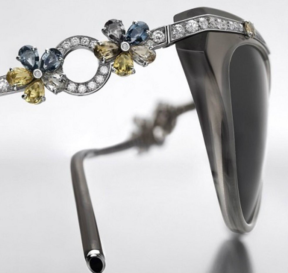 Цена – 59 000 долларов. Корпус этих очков украшен 18-каратным белым золотом, бриллиантами и голубыми сапфирами. Вокруг линз темная твердая оправа.