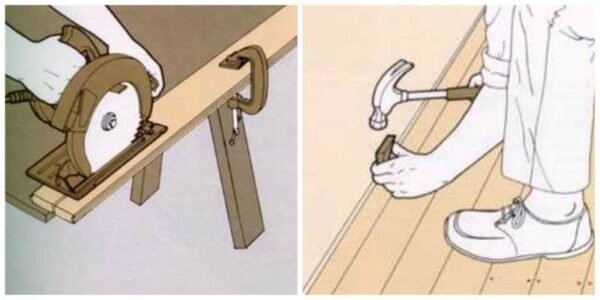 Для сплачивания используются струбцины, домкраты или клинья. Зазоры между половицами не допускаются. Крепление осуществляется насквозь с утапливанием головки гвоздя/самореза или под 45 градусов внутрь паза. Поскольку настеленный шпунт неизбежно придется дополнительно сплачивать после полугодичного – годичного усыхания, при первичной укладке лучше крепить его вертикально, а при окончательном монтаже через указанный срок – в замок под 45 градусов.