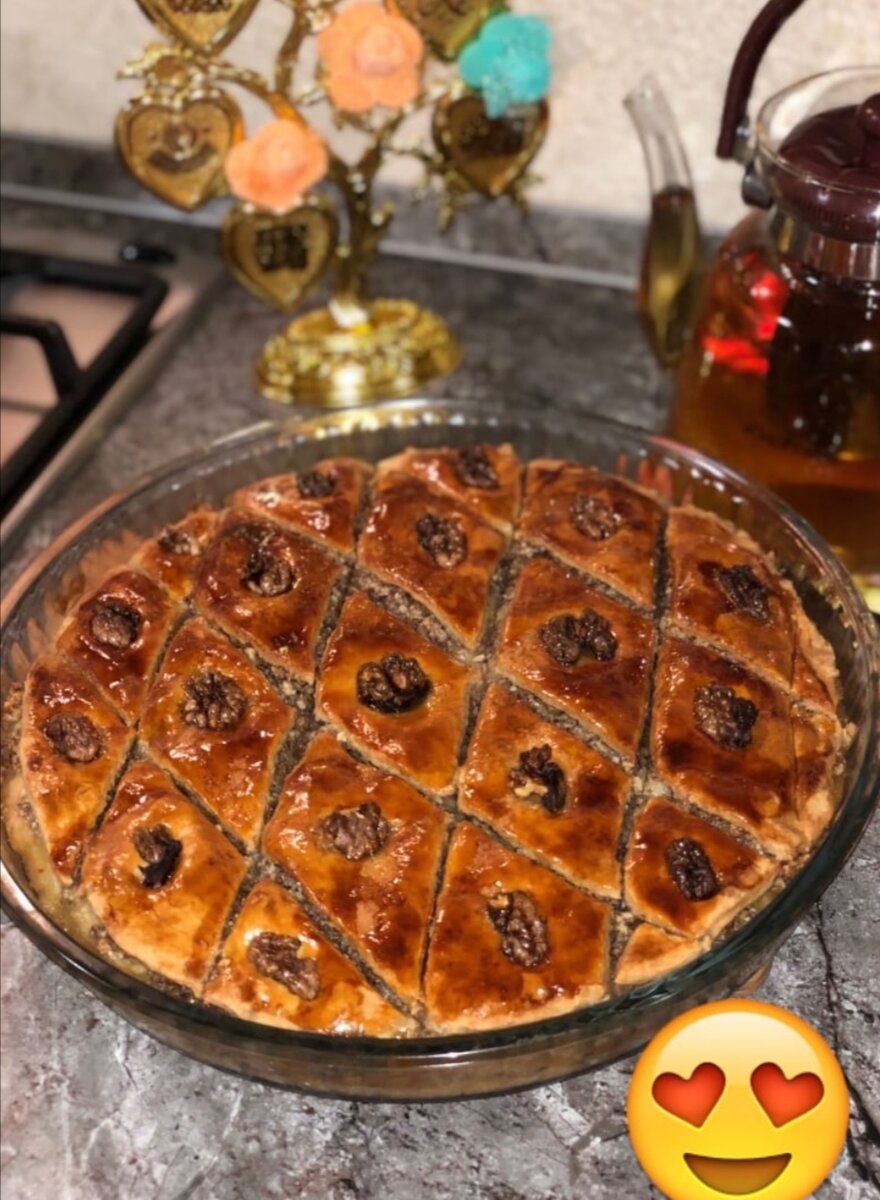 Ингредиенты: Мука 600 гр; Яйца 4 шт; Сода 1 ч. л; Сметана 300 гр; Масло сливочное 300 гр; Сахар 400 гр; грецкий орех 500 гр; Мёд 50 гр. Тесто: В первую очередь готовим тесто; В просторной чаше соберите муку и три желтка, добавьте рубленное сливочное масло. Начните перетирать ингредиенты. Масса должна привратится в крошку. В отдельной чаши, емкости, в сметану добавьте соду, перемешайте и добавьте в общую массу. Вымешивайте до получения гладкого теста. Тесто не должно липнуть к рукам. Подсыпайте муку при не обходимости. Готовое тесто оберните пищевой плёнкой и уберите в холодильник на 1-2 часа, но лучше на 2 часа. Дальше готовим начинку: Перед тем как начать готовить начинку отложите самые красивые 20 половинок орехов. Для украшения. Загружаем орехи и сахар в блендер и измельчаем очень мелко. Если нет блендера, можно самим измельчить, молотком, займёт много времени, но результат тот же. В полученную массу добавьте три белка и тщательно все перемешайте. Приготовление: Отдохнувшее тест