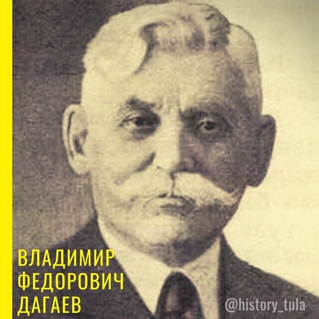 Дагаев Владимир Федорович родился в 1872 г. в селе Спасском на Орловщине. В 1902 г. Дагаев окончил Томский медицинский университет. В 1910-1911 гг. в Петербурге, в Институте экспериментальной медицины, Дагаев трудился под руководством знаменитого И. П. Павлова, ставил с ним опыты на животных, писал докторскую диссертацию, блестяще защитил ее. В 1914 г. В. Ф. Дагаев заведует всеми госпиталями Тулы, помогает коллегам оперировать раненых воинов. Одновременно трудится хирургом в Ваныкинской и Соматической (ныне областная детская) больницах. После 1917 г. основал в Туле филиал научно - исследовательского института здравоохранения и преподавал в нем. Здесь он оборудовал два рентгеновских кабинета с диагностической и лечебной аппаратурой, открыл лабораторию, создал патологоанатомическое детское, урологическое и отоларингологическое отделения. Владимир Федорович вложил много труда в создание нового корпуса хирургического отделения при больнице им. Д.Я. Ваныкина (проект архитектора В. Н. Сир