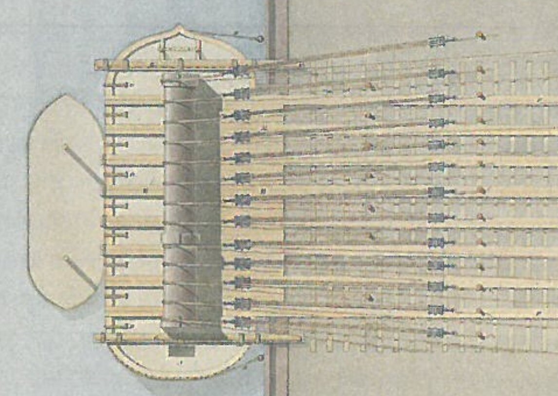 рис.2 Разрез, высота над плоскостью станков (кабестанов), используемых для выгрузки ствола колонны, в акварелях Антонио Адамини, Портфолио..., 1835, доска 29. Рисунок карандашом, китайскими чернилами и акварелью, л. 61,2; I. 97 см. Санкт-Петербург, Библиотека университета путей сообщения, инв. W-III-7, 29