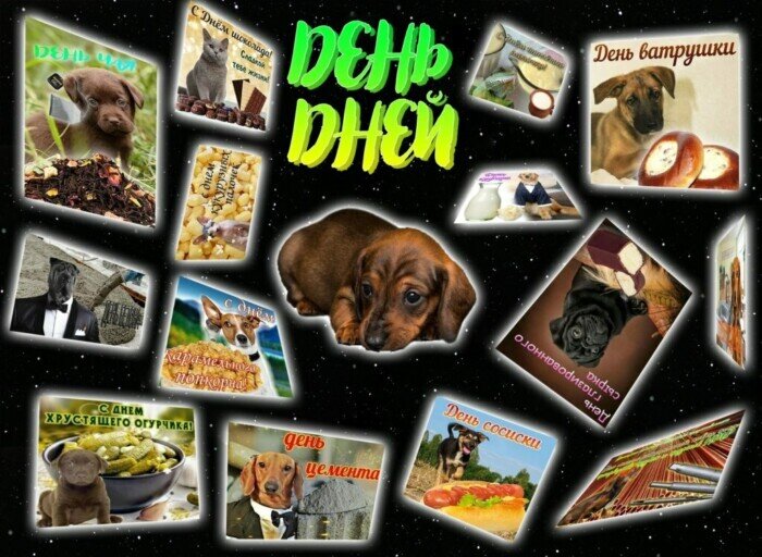 "С днем цемента и другие"- ряд мемов с поздравлениями с каким либо днем и прикрепленной картинкой,содержащей в себе фотографию того,чего отмечают в этот день,а также щенка. Происхождение Прародителем мема стали открытки, из социальной сети "Одноклассники",а также мессенджеров по типу "Viber" и "Whatsapp". Как правило, это поздравления с малозначительными или несуществующими праздниками. В сети стали утрировать и гиперболизировать на эту тему.Так стали появляться мемы. Наиболее старым можно назвать мем "День ватрушки".Он форсился еще до хайпа открыток типа "День цемента" Шутки над аудиторией “Одноклассников” в рунете давно стали классическими. Но в апреле 2020 года такого контента стало больше. Во многом благодаря паблику во вконтакте "Поздравления и открыточки". Контент из него стал расходиться в твиттере и ВКонтакте. Особенности В меме явна заметна особая стилистика:Вырвиглазный дизайн, чаще всего выдуманные дни,и щенок или другое животное почти на каждой картинке.Все это является г
