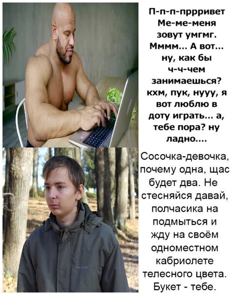 Сосочка-девочка, почему одна - четырехпанельный мем,представляющий из себя обращение к девушке двух персонажей,абсолютно разных по темпераменту Происхождение Как двухпанельный мем,эта картинка зародилась летом 2019 года: На ней изображались персонажи,которые в жизни или в вселенных книг, игр и др были представлены наоборот,в более сильном,мужественном и уверенном ключе. Как четырехпанельный мем,содержащий изречения двух персонажей,эта картинка появилась уже в конце 2019 года: На картинке представлены изречения двух персонажей:верхнее принадлежит как правило более слабому,неуверенному и неумеющему общаться герою,а нижняя наоборот,более сильному и крепкому герою,как правило типичному мачо. Но также есть и абстрактные картинки,типа верхней. Значение Мем служит для выделения любимых персонажей,людей и троллингом над теми,кого наоборот не любят в данном сообществе по интересам.