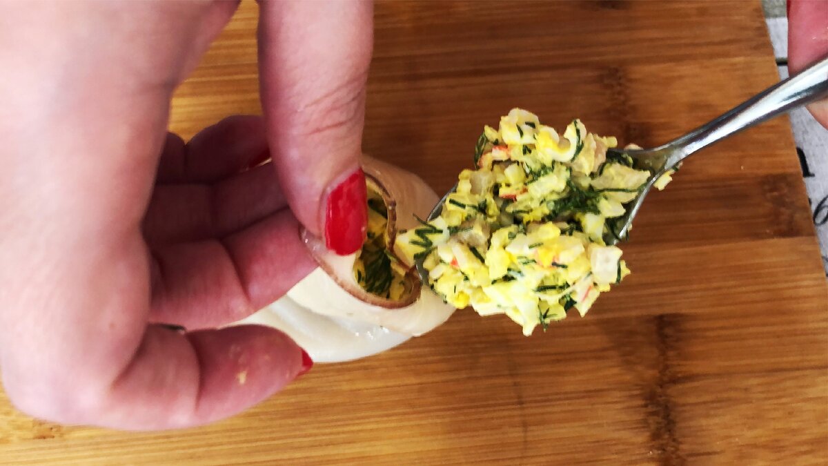 Фаршируем тушки кальмаров, полученной начинкой. Плотно заполняем.